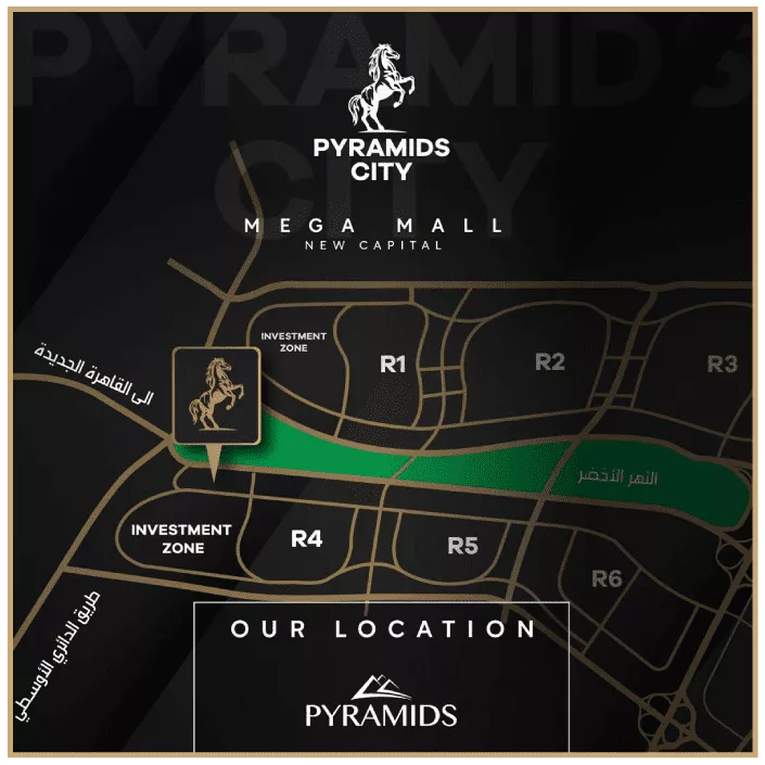 يقع مول pyramids city plaza في قلب العاصمة الإدارية، تحديدًا في مدخلها أمام أكبر الأحياء السكنية R4 وR5 وبإطلالة مباشرة على النهر الأخضر “أهم ممر مائي في العاصمة الإدارية الجديدة وأهم معالم العاصمة الإدارية بشكل عام.”